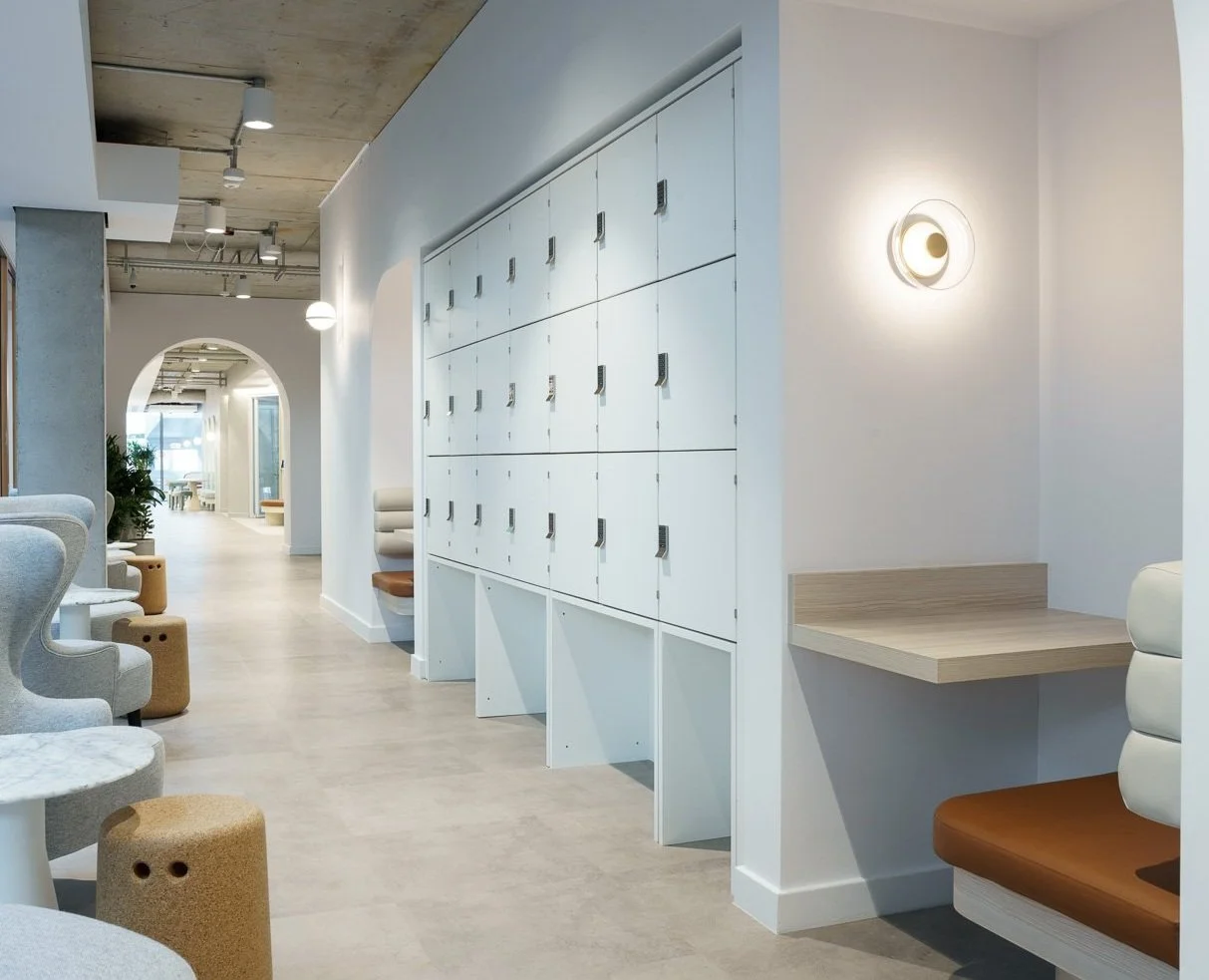 As many employees travel directly from the airport to the Dublin office, it had to be visitor-friendly. For this hallway space, we designed custom lockers with lower cubbies built for slide-in suitcase storage. We added a touch of lounge with Andreu World’s Reverse Occasional tables in a marbleized finish; pale gray wingback armchairs by Tom Dixon; and—for a touch of whimsy—Bob stools by Modus, made from recycled wine-bottle corks, with finger-holds for easy hobnobbing.