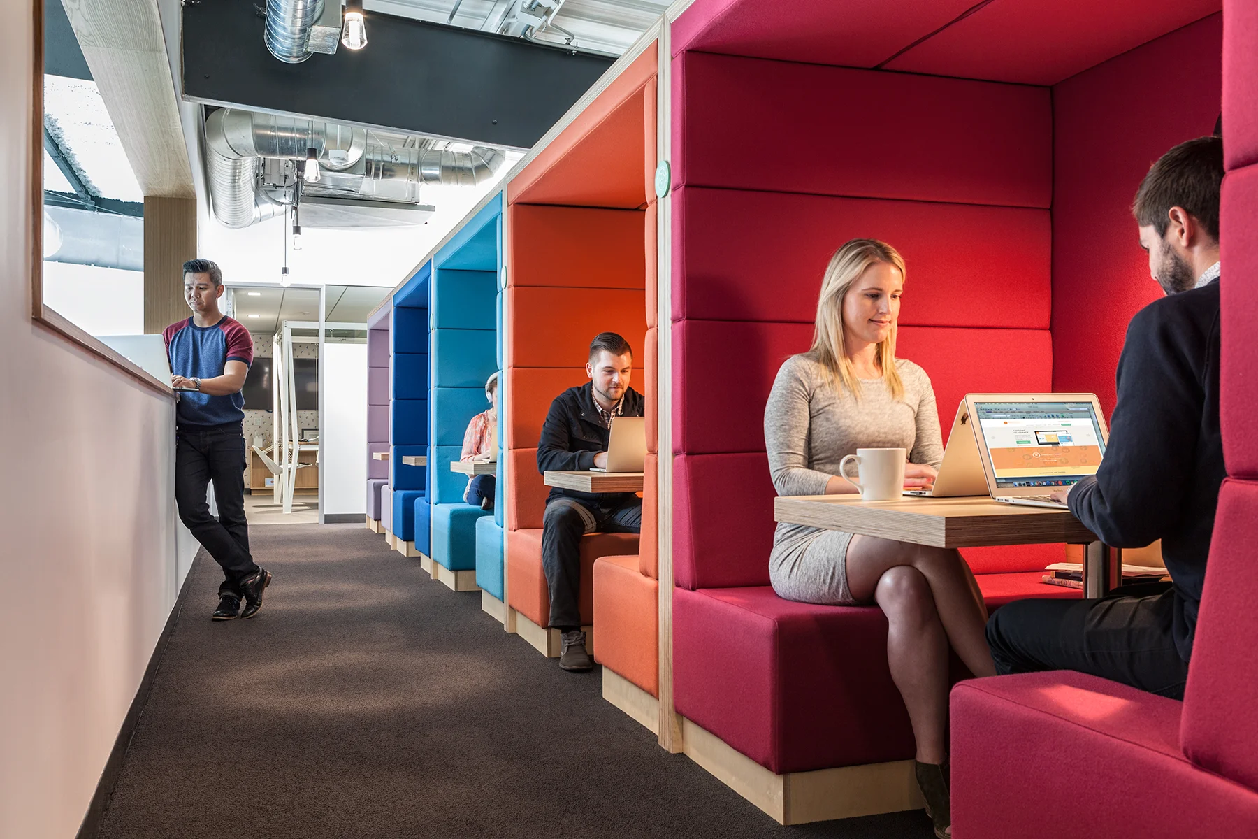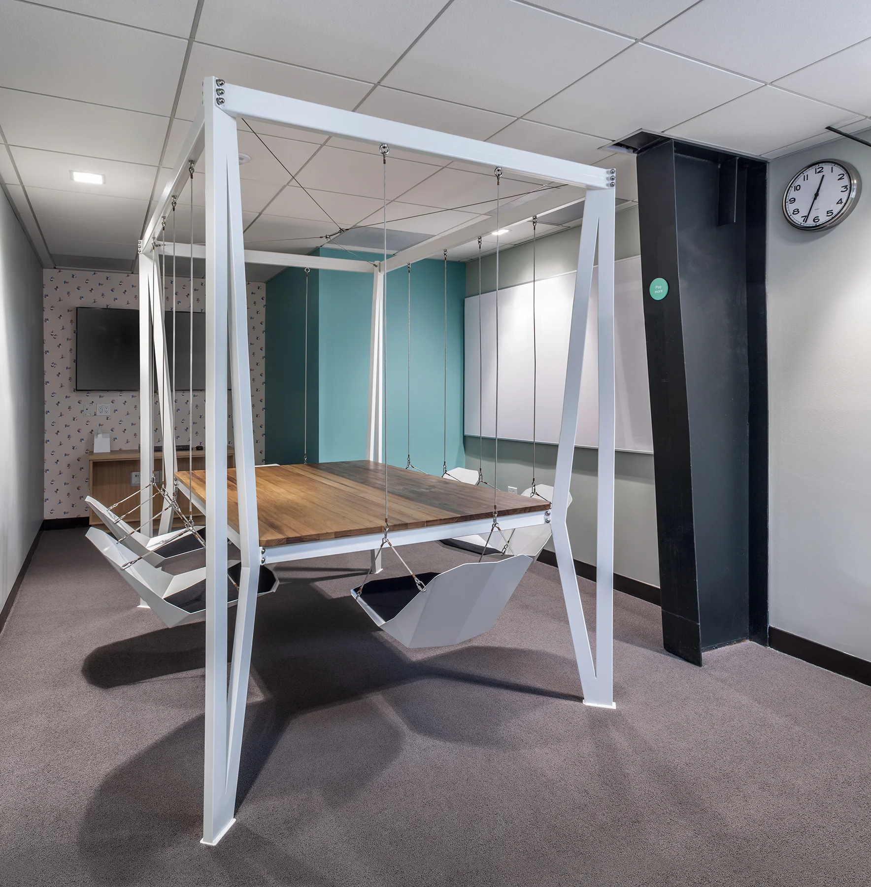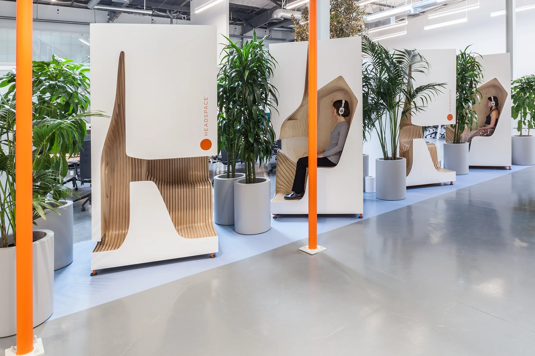 Some of the furniture pieces are originals for the project. In particular, the meditation pods developed by Dwayne Oyler and Jenny Wu were designed for Headspace to provide a wonderfully functional and aesthetic space to meditate.