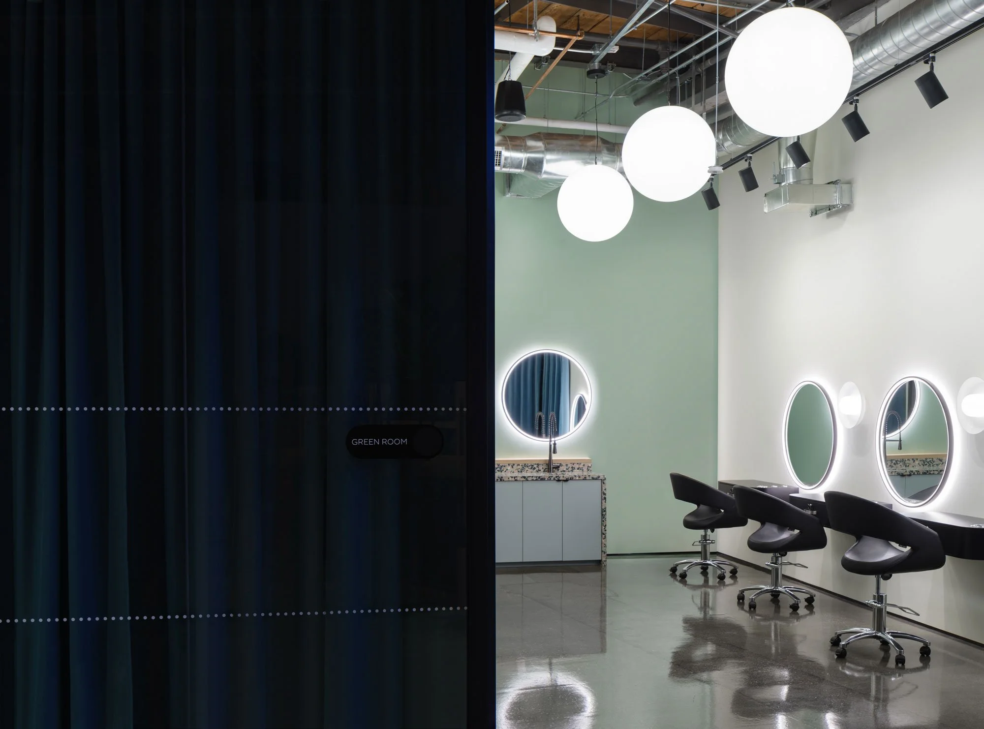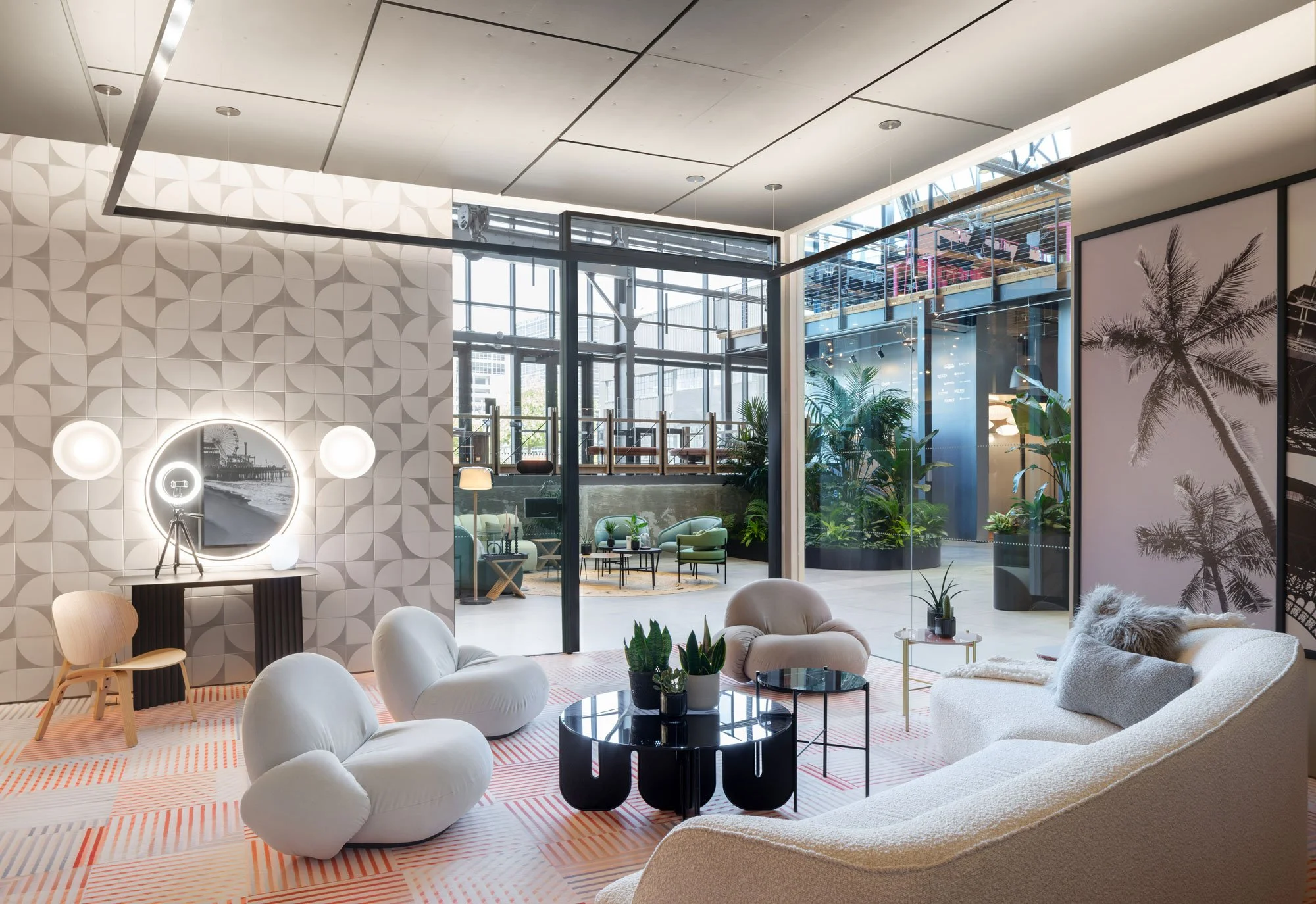 The Creator’s Studio offers a photogenic enclave for content creators. Located near the main entrance, this lounge is the perfect backdrop for striking a casual pose or unboxing a favorite product. Studio Blitz’s design goal here was a soft-toned, beachy-luxe feel. To complement this, two selected a sand-tinted sofa by Rove Concepts and cushy lounge chairs by Gubi, paired with an eclectic mix of slim-topped tables by Article, RS Barcelona, and Bend Goods.