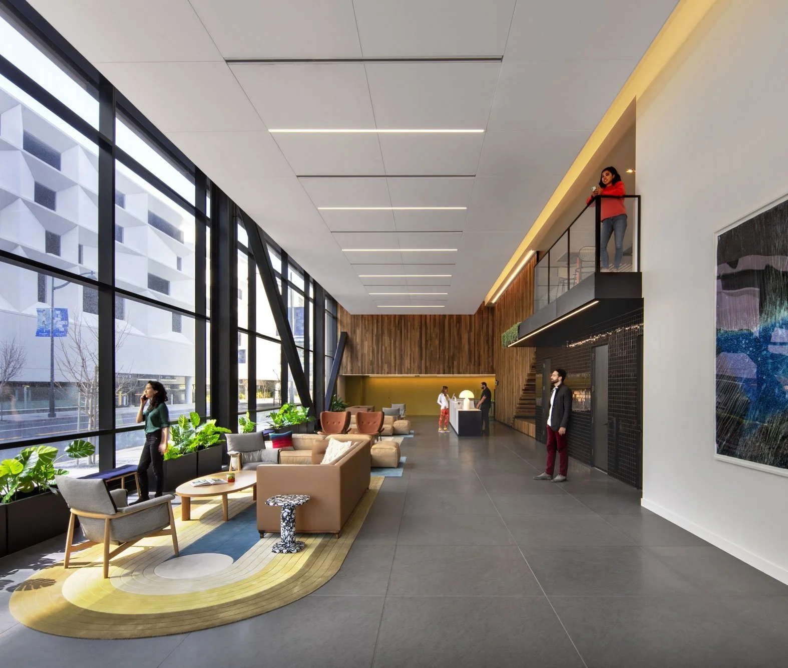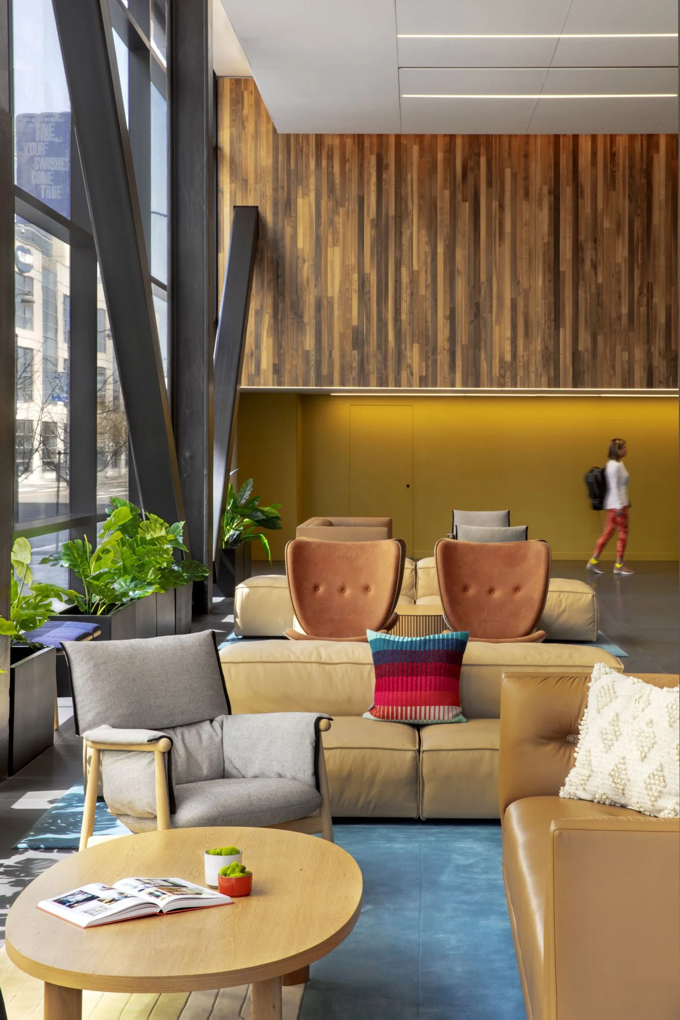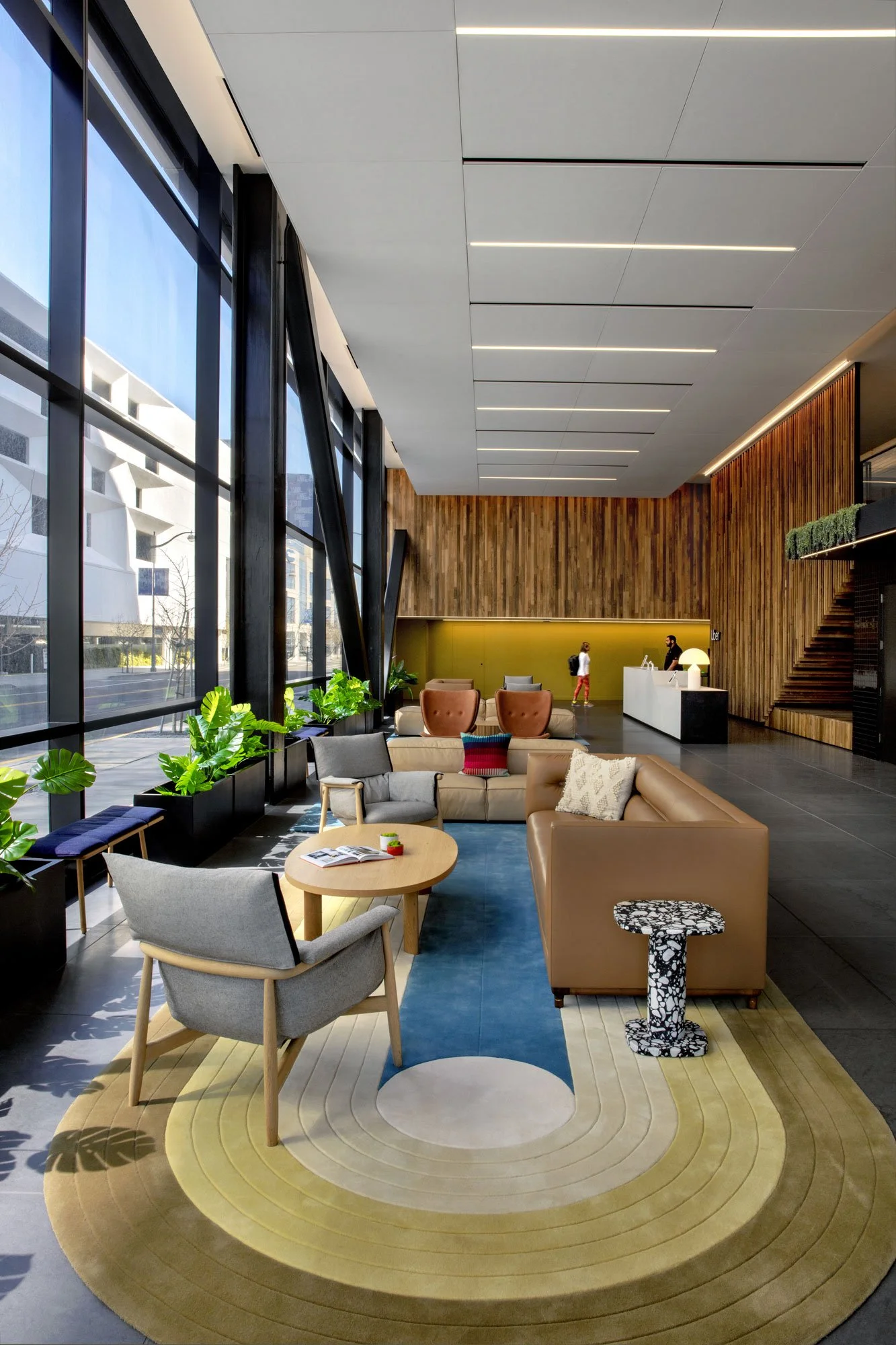 Each building features its own color—red, green, yellow, or blue—that is used throughout the space in elements ranging from wall paint to furniture, graphic paneling systems, and even desk drawers. The large entryway above is in the “yellow” building, and the color is present in the rug, furniture, and accent pieces that we helped select.