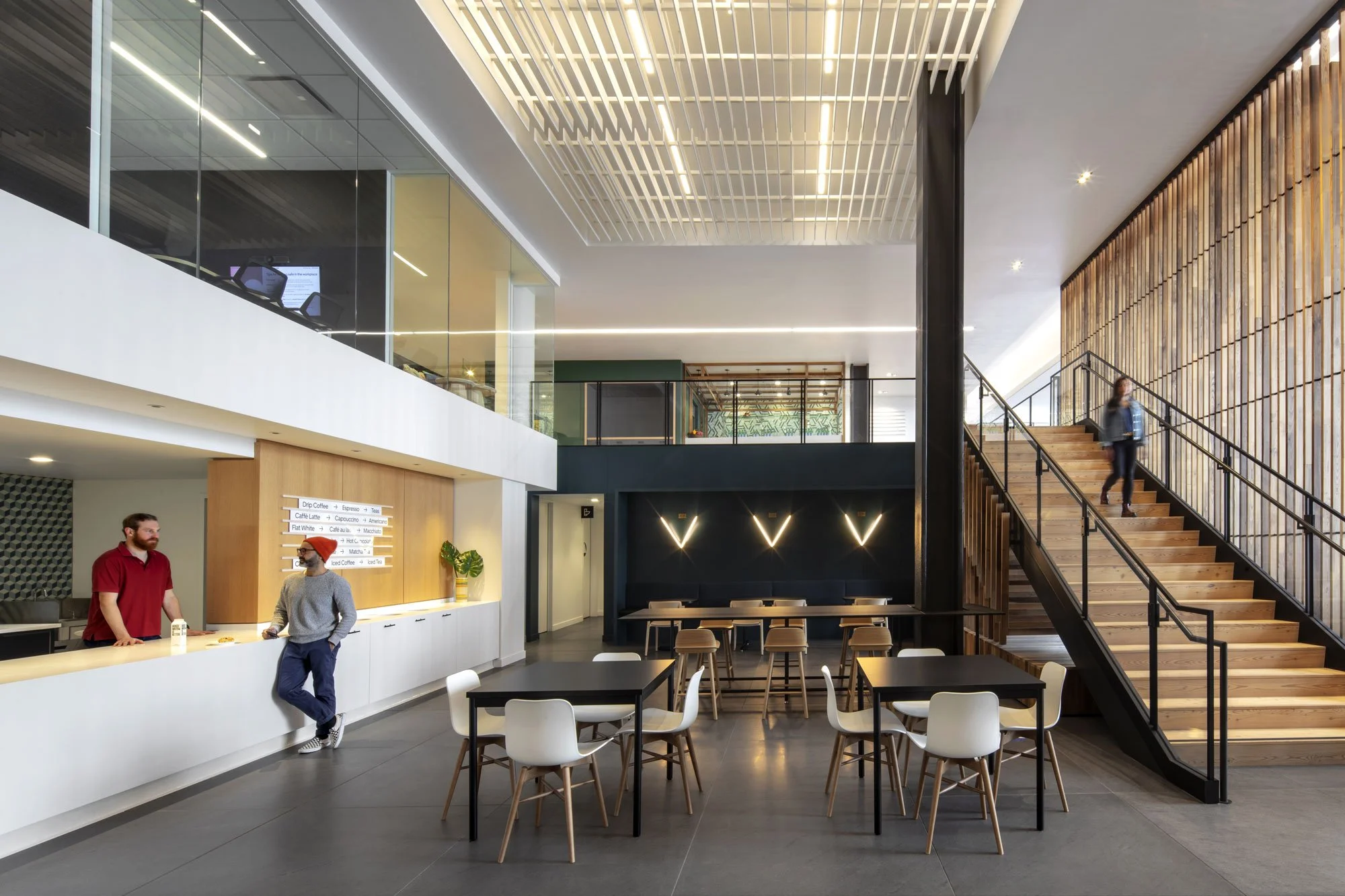 For coffee-shop-style transitional spaces, we selected furniture that supports a feeling of hospitality while still boasting a chic, modern look.